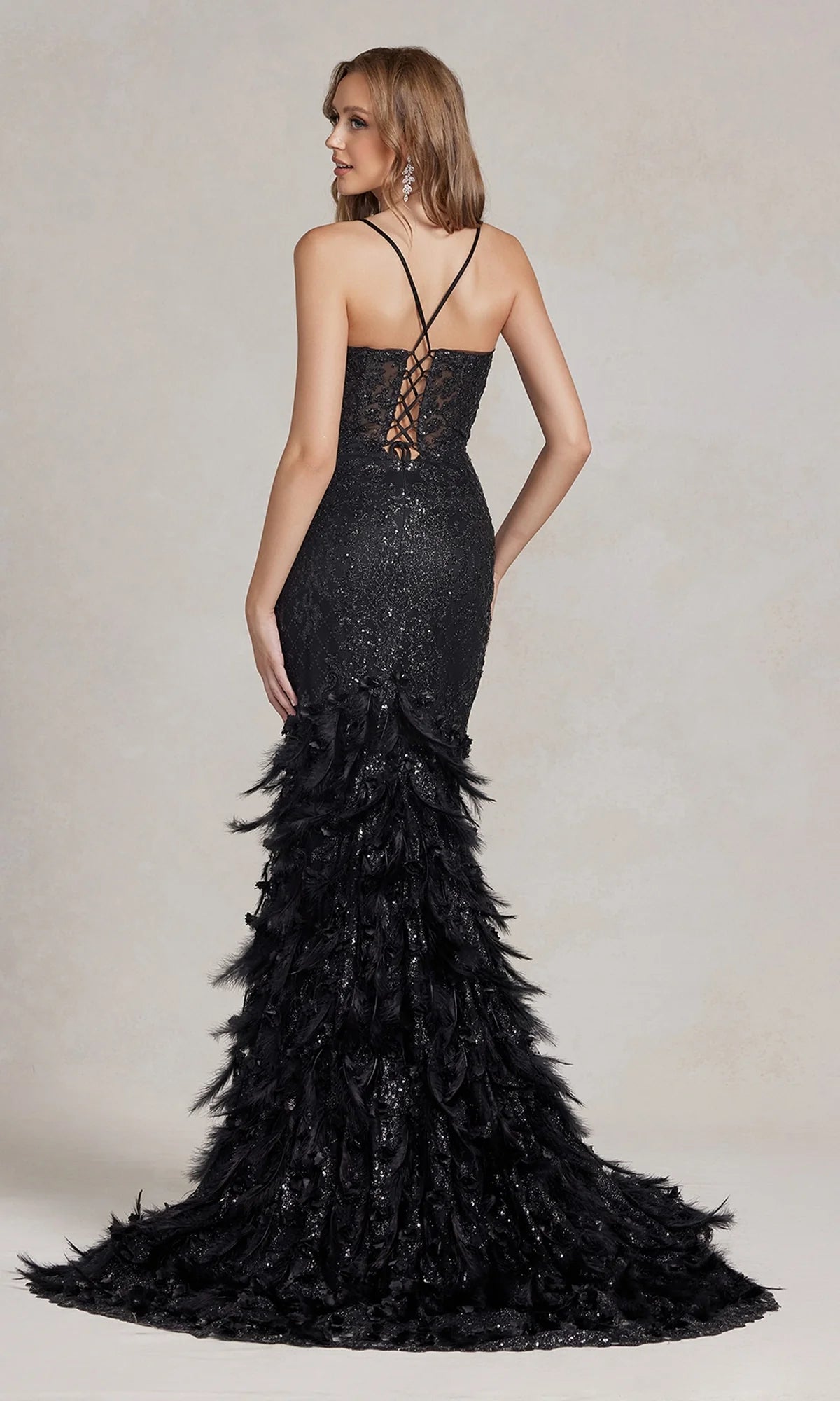 Sequin Prom Dress with Feathers and 3-D Flowers