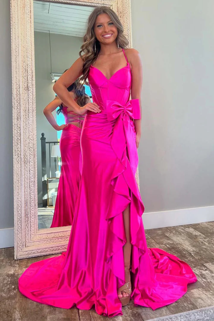 Slit Ruffle Hot Pink Fitted Prom Dress with Bow
