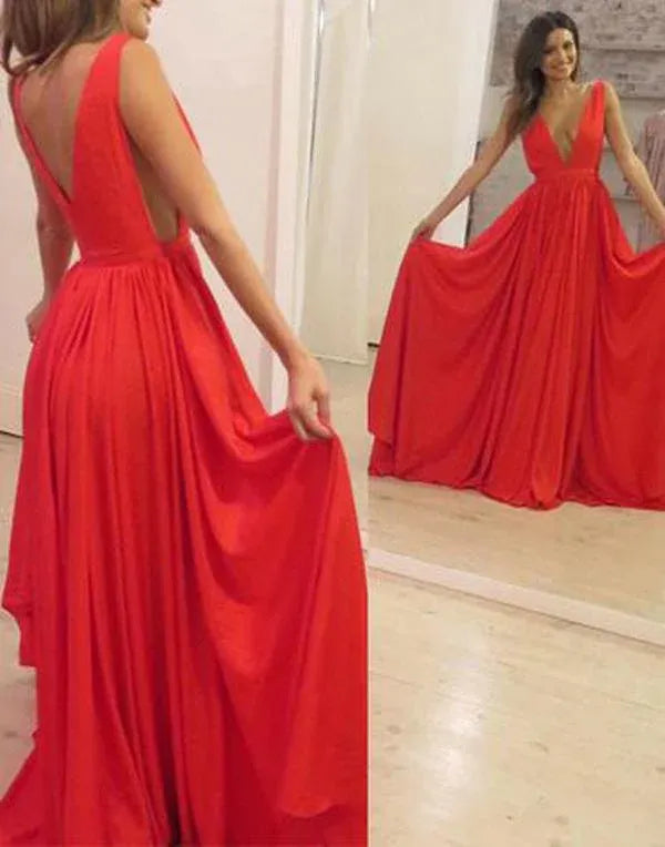 Shine at prom in this crimson chiffon gown—featuring a flowing A-line silhouette, bold deep-V neckline, open-back, practical side pockets, and sweeping train. The lightweight fabric balances allure and comfort, perfect for prom, formal galas, or evening events. Pair with gold accessories to elevate its striking vibe.